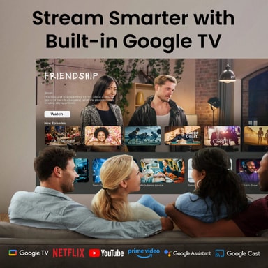 Bileet käyntiin hetkessä – ei monimutkaista asennusta. Sisäänrakennettu Google TV tarjoaa välittömän pääsyn Netflixiin, YouTubeen, Prime Videoon ja muihin. Popcorn on valmis, kaverit paikalla – paina vain play.