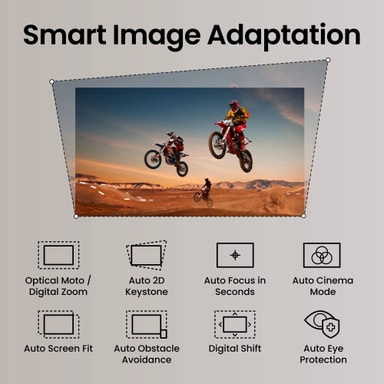 TK705i:n 8-suuntainen Smart Image Adaptation tarkentaa, keskittää ja suoristaa kuvan välittömästi – ilman manuaalista säätöä. Säädä helposti kuvan kokoa: optinen zoom säilyttää häviöttömän 4K-terävyyden, ja digitaalinen zoom mahdollistaa koon hienosäädön ilman projektorin siirtelyä.