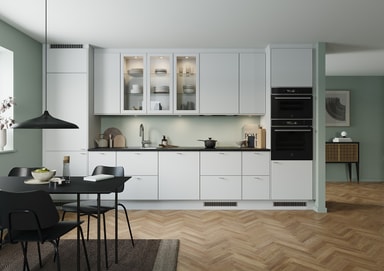 Puhdista ovet ja laatikoiden etuosat pehmeällä, kostealla liinalla. Tarvittaessa voit käyttää mietoa pesuainetta. Vältä pesuaineita, jotka sisältävät ammoniakkia, alkoholia, valkaisuaineita tai hankaavia aineita. Pyyhi puhtaalla vedellä ja sitten puhtaalla ja kuivalla liinalla. Varmista, että kaikki pesuainejäämät on pyyhitty pois värimuutosten välttämiseksi, ja muista pyyhkiä ovien alareunat. Vältä höyryä tuottavien laitteiden, kuten vedenkeittimien ja kahvinkeittimien, sijoittamista suoraan ovien ja kaappien alle.
