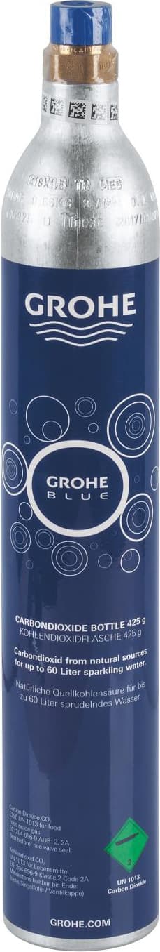 Grohe Blue -CO2-pullon avulla saat suodatettua kuplavettä hanasta milloin tahansa. Pullo sisältää luonnollisista lähteistä peräisin olevaa hiilidioksidia ja sen avulla saat noin 60 litraa kuplavettä. Yhteensopiva Grohe Blue -vesijärjestelmän kanssa.