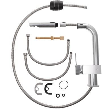 Tekniset tiedot • Kokonaismitat (LxSxK): n. 222 x 117 x 298 mm • Pidentyvä letku: n. 145 mm • Korkeus jalustasta: n. 200 mm • Kantokorkeus: n. 175 mm • Kahvan pituus: n. 200 mm • Kahvan pituus: n. 175 mm • Kahvan pituus: n. 55 mm • Liitäntätyyppi: korkeapaine • Paine: 3 - 10 bar • Liittimet: 3/8"" • Liitosletku: n. 370 mm • Paino: n. 1,5 kg • Materiaali: messinki, kromi