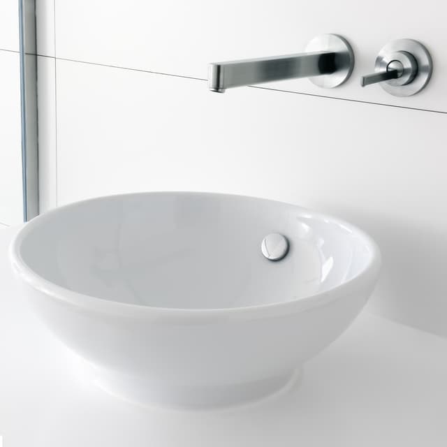 Pienellä reunalla varustettu minimalistinen pyöreä muotoilu yhdistää esteettisen ilmeen tilavaan ja tilaa säästävään pesutilaan.