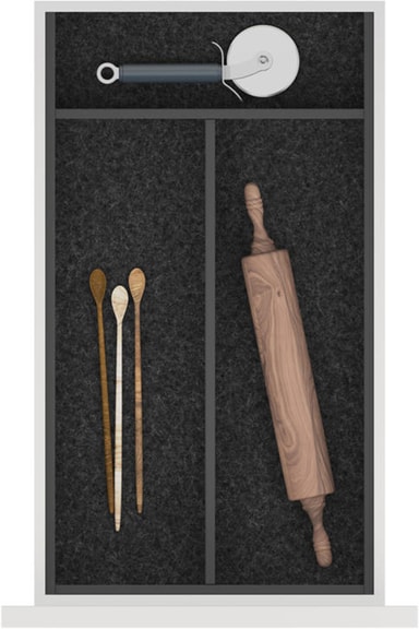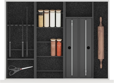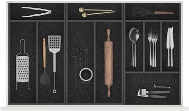 Pidä keittiövälineesi järjestyksessä laatikon sisälle asennettavan Epoq Flex -laatikon avulla. Tämä alumiinista valmistettu ja säädettävän kokoinen kestävä keittiötarvike on ehdoton hankinta.