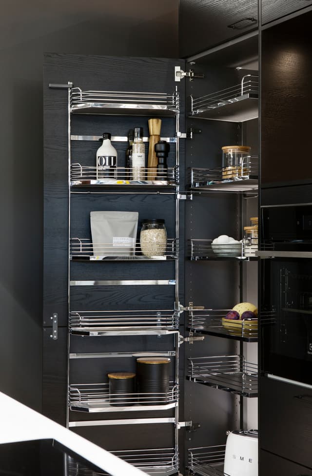 Tandem on ulosvedettävä säilytysjärjestelmä jossa 6 tasoa, 50 ja 60 cm leveisiin korkeisiin kaappeihin.