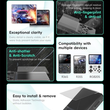 Äärimmäinen suojaus: Suojaa R36S-käsikonsoliasi naarmuilta, pölyltä ja iskuilta tällä kattavalla suojasarjalla. Korkea-alumiiniset lasinäytönsuojat tarjoavat erinomaisen naarmuuntumisenkestävyyden, kun taas mukana toimitettu kantolaukku tarjoaa kattavan suojan kuljetuksen ja varastoinnin aikana.