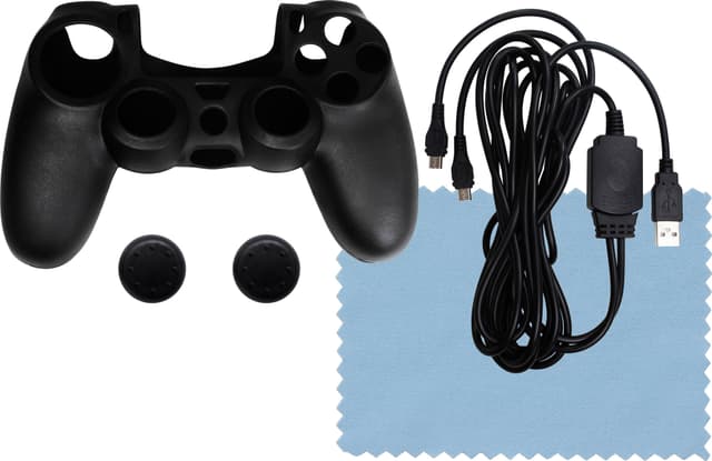 Gioteck tarvikepakkaus PS 4 -peliohjaimelle sisältää silikonisen suojakuoren ja peukalopainikkeet. USB Play- ja latauskaapelilla (2.5m)voit ladata kahta peliohjainta samanaikaisesti.Kätevällä puhdistusliinalla pidät peliohjaimet siistinä.