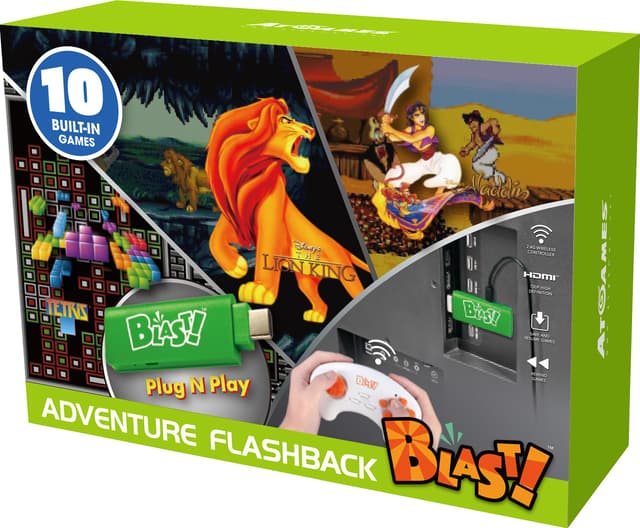 AtGames Adventure Flashback Blast! -pelikonsolilla pelaat useita hauskoja retropelejä, kuten esimerkiksi The Lion King, Aladdin, The Jungle Book ja Tetris. Pienikokoinen laite kulkee helposti mukanasi, ja sen myyntipakkaukseen sisältyy ohjain.