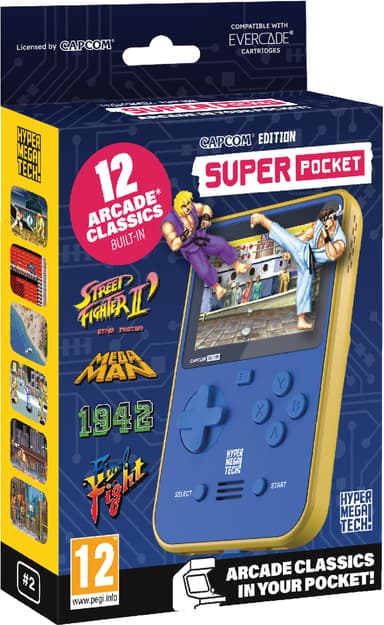 Kannettavassa HyperMegaTech Capcom Super Pocket -pelilaitteessa on 12 klassista peliä. Siinä on 320x240 pikselin IPS-näyttö, USB-C-lataus ja yli 4 tunnin akkukesto. Sisäänrakennetun Evercade-kasettituen ansiosta voit käyttää yli 600 lisäpeliä.Tutustu ominaisuuksiin