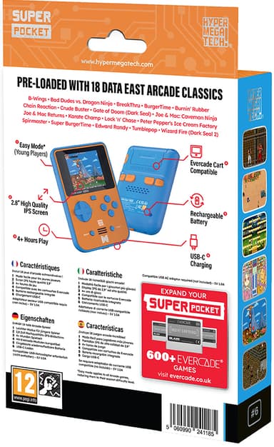 Kannettavassa HyperMegaTech Data East Super Pocket -pelilaitteessa on 18 klassista peliä. Siinä on 320x240 pikselin IPS-näyttö, USB-C-lataus ja yli 4 tunnin akkukesto. Sisäänrakennetun Evercade-kasettituen ansiosta voit käyttää yli 600 lisäpeliä.Tutustu ominaisuuksiin
