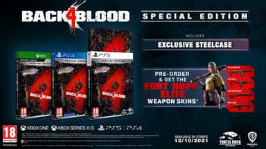 Back 4 Blood - Special Edition -versio sisältää pelin FuturePak-metallipakkauksessa. Olet keskellä sotaa riddenejä vastaan. Kuolettavan loisen uhreiksi joutuneet ihmiset ovat muuttuneet olennoiksi, joiden tehtävä on tuhota loput sivilisaatiosta.Tutustu ominaisuuksiin