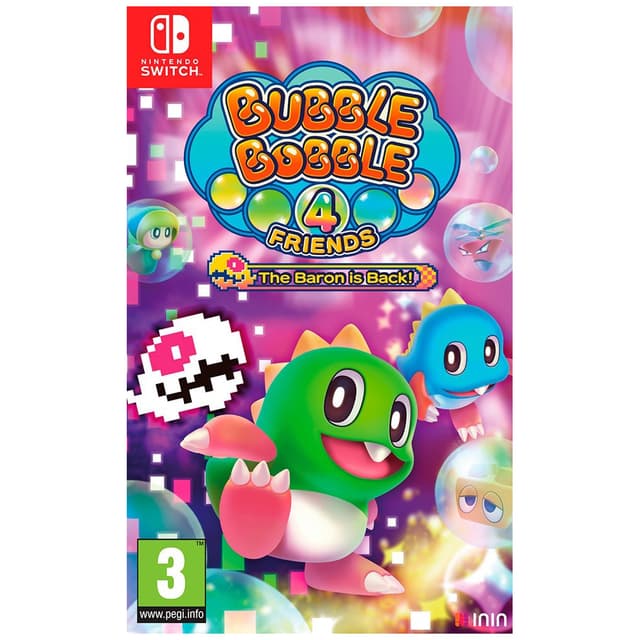 Bubble Bobble 4 Friends: The Baron is Back! -pelissä on 100 uutta tasoa ja 4 pelaajan yhteistyötila. Valmistaudu hyppimään, puhaltamaan kuplia ja tuhoamaan vihollisia Bub ja Bob -lohikäärmeiden kanssa!Tutustu ominaisuuksiin