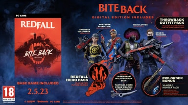 Dig your teeth into the Bite Back Edition and receive the Redfall Hero Pass, the Throwback Outfit Pack, Laser Beam multi-weapon skin, and the Tactical Knife Stake weapon attachment for close-range fights. The Redfall Hero Pass gives you access to two future heroes with unique powers and gameplay. The Throwback Outfit Pack includes a unique outfit and backpack for each of the four base heroes inspired by their lives before Redfall.