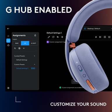 Kuulokkeita voi mukauttaa Logitech G HUB -ohjelmiston avulla, jonka avulla voit säätää äänen taajuuskorjausasetuksia, hienosäätää mikrofonia ja hallita muita kuulokemikrofonin asetuksia.