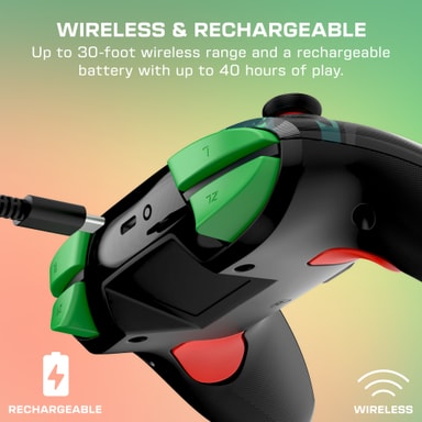 Ohjain yhdistyy pienen viiveen 2,4 GHz langattomalla yhteydellä, jonka kantama on 30 m, joten pelaat ilman kaapeleita. Mukana tulee myös USB-C-kaapeli nopeaan lataukseen tai johtokäyttöön Switch-telakassa.