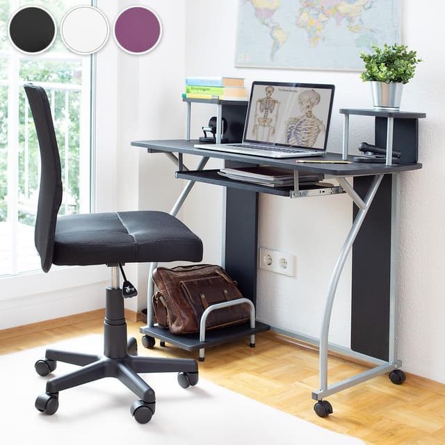 Kohokohdat • moderni muotoilu • säilytystilaa • näppäimistölaatikko • tietokonehylly voidaan sijoittaa joustavasti • 4 kääntöpyörää, joista 2 pyöränlukolla • Färg: valkoinen