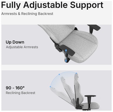 Säädä korkeutta luokan 4 kaasujousen avulla samalla kun tuoli tarjoaa 90-160 asteen kallistuksen kulmalukituksella. Vältä lihasten rasitusta 2D-käsinojien avulla ja helpota ranteiden paineita.
