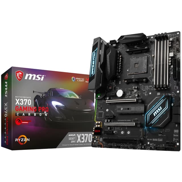 Build a heavy-duty gaming machine that runs even high-end gameseasily with MSI X370 Gaming Pro Carbon motherboard. The motherboard comes in ATX format, supports AMD Ryzen or 7th gen. A-series and Athlon processors on AM4 socket, multi-GPU setup and has customizable Mystic RGB LED lighting. You can install up to 64 GB fast DDR4 RAM as well as enhance the responsiveness of your setup with super fast M2.SSD storage. Expansive wired connectivity lets you hook up a 4K UHD monitor, 7.1 HD audio setup or speedy USB 3.1 devices.