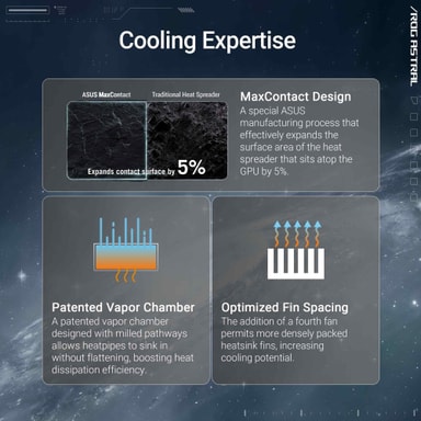 ASUS GeForce RTX 5090 ROG ASTRAL OC -näytönohjaimessa on 4 tuuletinta, jotka tehostavat ilmankiertoa 20 %. Siinä on 32 GB GDDR7-muistia, höyrykammio ja 80 A MOSFETit, jotka tarjoavat 35 % enemmän tehotilaa.Tutustu ominaisuuksiin