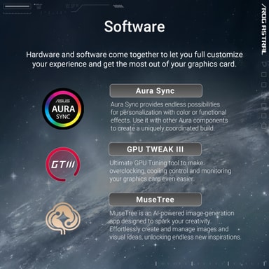 ROG Astral käyttää GPU Tweak III:a tarkkaan säätöön, Power Detector+:aa kaapelien kunnon valvontaan ja MuseTreetä tekoälykuvien luomiseen.