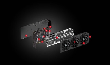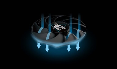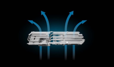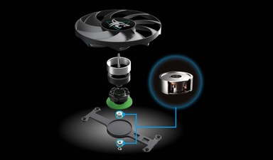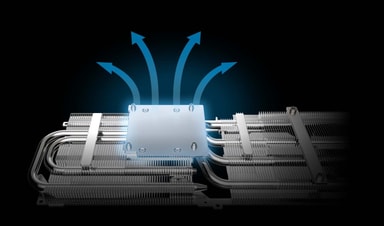 Sileä kuparipohja on suorassa kosketuksessa näytönohjaimen kanssa, mikä parantaa lämmönsiirtoa ja tehostaa VRAM-lämmönpoistoa. Korkean lämmönjohtavuuden Honeywell PTM7950 -lämpötyyny täyttää mikroaukot näytönohjaimen ja jäähdytyselementin välillä suurilla kuormituksilla.