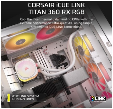 Pidä prosessorisi lämpötila kurissa 360 mm Corsair iCUE LINK TITAN RX RGB -nestejäähdyttimellä. Siinä on kolme RS120-tuuletinta, mukautettava RGB ja mukana toimitettava iCUE LINK System Hub, jonka avulla voit synkronoida kaikki Corsair-komponentit.Tutustu ominaisuuksiin