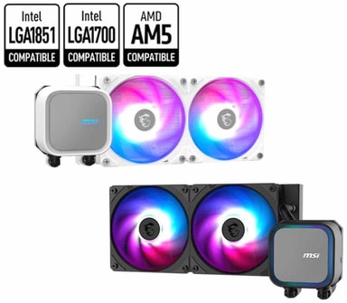 MAG CORELIQUID A13 240 -nestejäähdytin jäähdyttää prosessoria kahdella 120 mm ARGB-tuulettimella ja alumiinisilla jäähdyttimillä. PWM-tuki takaa tarkan tuulettimen ohjauksen. Yhteensopiva AM5-, LGA1851- ja LGA1700-kantojen kanssa.Tutustu ominaisuuksiin