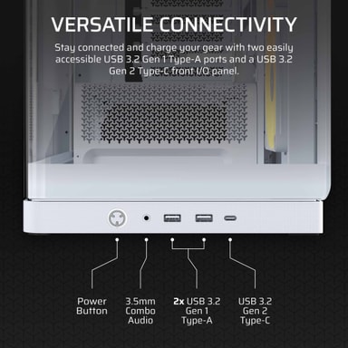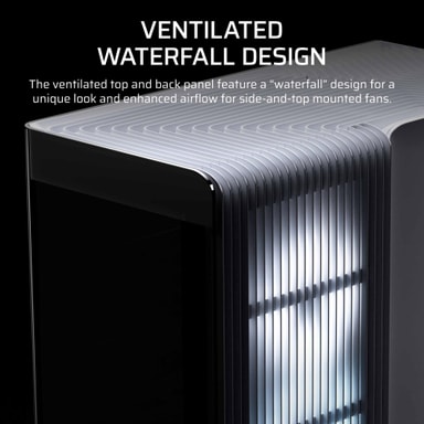 Tyylikkäässä PC-kotelossa on yksiosainen, etu- ja sivupaneelin ympäri kaartuva lasi, joka antaa selkeän ja katkeamattoman näkymän kokoonpanoon. Moderni ulkoasu käyttää pehmeitä, sulavia linjoja, ja modulaarinen FRAME-järjestelmä mahdollistaa kotelon osien muokkaamisen tarpeiden muuttuessa. Tilava sisätila tukee kookkaita komponentteja ja sisältää säädettävän näytönohjaimen painumisenestotuen, joka pitää rakenteen vakaana ja linjat siisteinä.