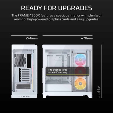 Corsair FRAME 4500X LX-R RGB -tietokonekotelo esittelee kokoonpanosi lasirakenteen ansiosta. Se tukee tehokasta jäähdytystä kahdella 360 mm jäähdyttimellä ja sisältää kolme iCUE LINK RGB -tuuletinta.Tutustu ominaisuuksiin