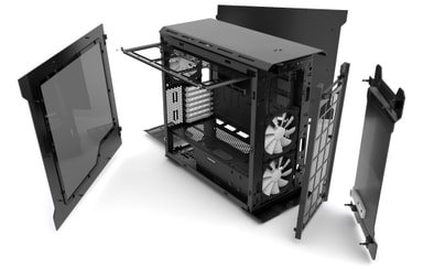 Jäähdytys: Kotelossa on kolme valmiiksi asennettua 140 mm tuuletinta (kaksi edessä, yksi takana) sekä tilaa yhdelle 120 mm tai 140 mm lisätuulettimelle edessä ja 3x 120 mm tai 2x 140 mm tuulettimelle yläosassa. Voit asentaa kotelon etuosaan myös nestejäähdytyksen, sillä siinä on jäähdyttimen kannattimet, säiliön kiinnikkeet sekä tilaa pumpun asennukselle.
