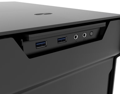 Yläpaneeli: Kotelon yläpaneelissa on kaksi nopeaa USB 3.0 -porttia, erilliset 3,5 mm liitännät kuulokkeille ja mikrofonille, reset-painike sekä ON/OFF-virtapainike.
