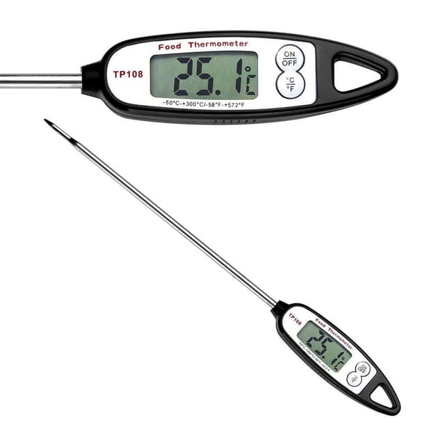 Todella hyvä digitaalinen lämpömittari, joka soveltuu hyvin ruoanlaittoon ja grillaukseen. Voi näyttää sekä Celsiuksen että Fahrenheitin. Mittari-tikku jonka voi työntää paistiin oikean paistolämpötilan tarkistamiseksi. Näyttää oikean lämpötilan nopeasti ja erittäin tarkasti. Lämpömittarissa on kaksi Clear LCD -näyttöä, jotka toimivat vain yhden LR-44-nappiparistopariston avulla (tulee pakkauksen mukana). Mittausalue: -50 ... + 300 ℃.