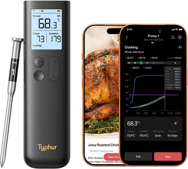 Yhdistettynä Typhur-sovellukseen käyttäjä saa käyttöönsä lämpökäyrät, yksityiskohtaiset kypsennysohjeet, reseptiominaisuudet ja älykkäät hälytykset, jotka tarjoavat täydellisen kokonaiskuvan ruoanlaitosta.