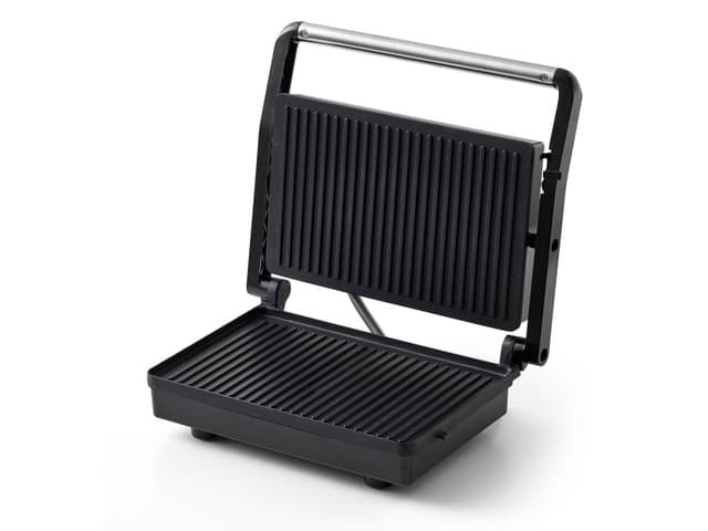 Small panini grill with a grill surface of 18 x 28 cm. Perfect for bread and for heating large vegetable pieces or a delicious sandwich. The grill plate has non-stick coating, and the lid has tilt hinges so that it lies horizontally, even on top of t