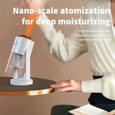 Tulivuoren liekkiefekti: Koe tulivuorenpurkauksen lumoava visuaalisuus ilmankostuttimemme sisäänrakennetulla liekkiefektillä. Tämä ainutlaatuinen ominaisuus luo rauhoittavan ja vangitsevan tunnelman, joka sopii täydellisesti rentoutumiseen tai koristeeksi missä tahansa huoneessa. Realistinen liekkisimulaatio lisää ripauksen draamaa ja lämpöä, parantaa ympäristöäsi ja tarjoaa rauhoittavan aistikokemuksen. Nauti luonnon voiman kauneudesta ilman vaaraa.