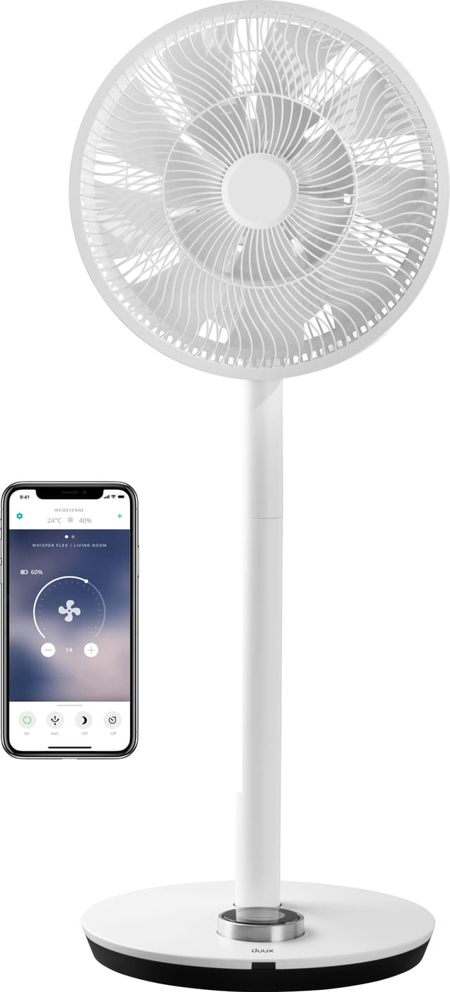 Duux Whisper Flex Smart -lattiatuuletin sopii kaikenlaisiin tiloihin sekä myös pöydille mukautettavan pituutensa ansiosta. Hiljaisessa tuulettimessa on 26 nopeusasetusta ja useita käyttötiloja. Pysty- ja vaakatasoisen liikkeen ja kaukosäätimen ansiosta se sopii kaikenlaisiin talouksiin.