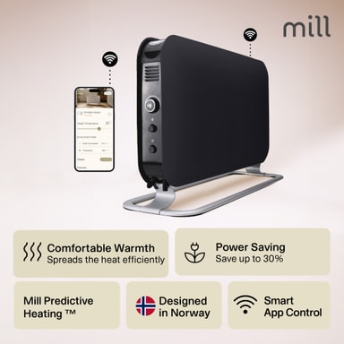 Mill Predictive Heating: Ennakoiva lämmitysjärjestelmä käyttää koneoppimista säätääkseen huoneen lämpötilaa itsenäisesti. Tämä antaa lämmittimelle mahdollisuuden analysoida huoneen lämpötilaa ja säätää tehoa sen mukaan, mikä varmistaa optimaalisen mukavuuden ja säädön ilman manuaalista puuttumista.