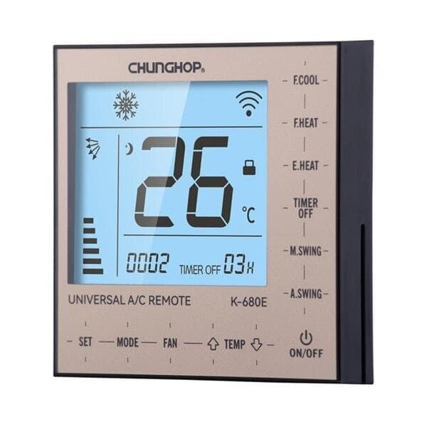 CHUNGHOP K-680E on luotettava yleiskaukosäädin ilmastointilaitteille, joka korvaa rikkoutuneen tai kadonneen kaukosäätimen. Se on yhteensopiva useimpien ikkuna-, seinä-, split- ja DC-invertterimallien kanssa. Selkeän LCD-näytön ja helppokäyttöisten painikkeiden ansiosta sitä on vaivatonta käyttää. Siinä on myös älykkäitä toimintoja, kuten kello, ajastin, nopea lämmitys/jäähdytys, lämpötilan lukitus sekä muistitoiminto, joka säilyttää asetukset myös sähkökatkon jälkeen.