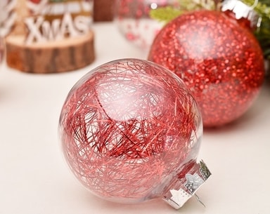 Tämä setti sisältää 30 palloa neljässä eri mallissa: läpinäkyvä, jossa on punaisia helmiä, hienojakoista glitteriä, yksi, jossa on hieman karkeampaa glitteriä, ja yksi, jossa on punaisia glitteripaloja ja hopeinen riipus.