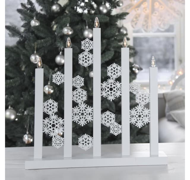 Hieno laserleikattu kynttilänjalka lumihiutaleilla. Kynttilänjalassa on 5 led-valoa ja monia mukavia yksityiskohtia. Aseta ikkunaan tai senkkiin upeaan joulutunnelmaan. Virtajohto 1,8m, kytkimellä. LED-lamput mukana, ei vaihdettavissa. Elinikä noin 10000h. 46xH48cm