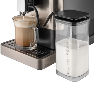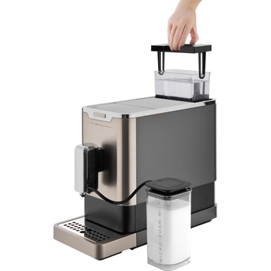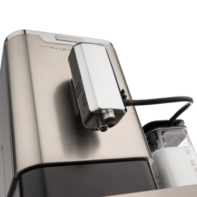 TOIMINNOT JA OMINAISUUDET Valmista herkullinen latte tai kermainen cappuccino micro foam -maitovaahdolla vain yhdellä kosketuksella. 2 kestävää Tritan-säiliötä maito- tai soijajuomille Ensimmäinen pisara suosikkikahviasi jo 42 sekunnin kuluttua. 150 gramman kahvipapusäiliö + erittäin suuri pidike suosikkikahvipavuillesi (yhteensä 300 g kahvia) Patentoitu höyrysuutin - edistyksellinen tekniikka kompaktissa koossa. Höyrysuuttimen voi pestä astianpesukoneessa Espresso- ja Lungo-ohjelmien käynnistys yhdellä kosketuksella. Kuumavesitoiminto americanon tai teen valmistamiseen