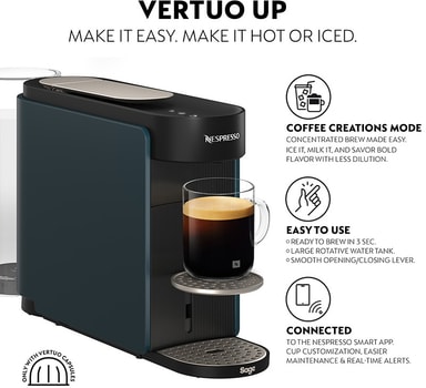 Nespresso Vertuo UP Solo -kapselikahvikoneessa on 1,4 l vesisäiliö, 2 min automaattisammutus ja 3 s lämmitysaika. Valmista kuumia ja kylmiä juomia. Yhteensopiva Nespresso Smart -sovelluksen kanssa.Tutustu ominaisuuksiin