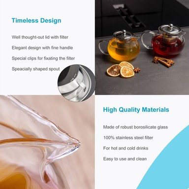 SUUNNITTELU: Tämä tyylikäs lasinen teekannu tekee vaikutuksen yksinkertaisella mutta modernilla muotoilullaan. Se on erityisen käytännöllinen ohuen kahvan ja hyvin harkitun kannen ja suodattimen ansiosta!