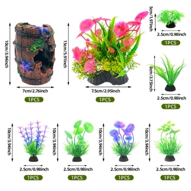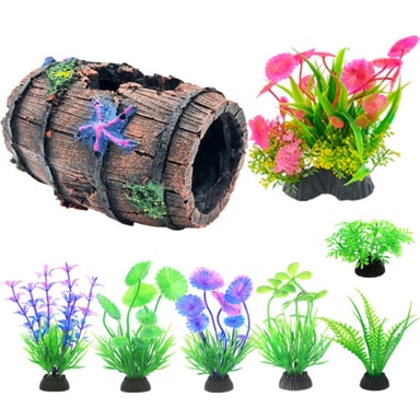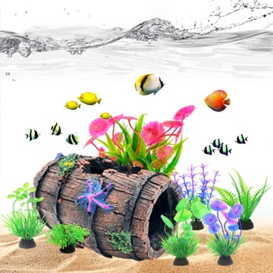 Parantaa akvaarion estetiikkaa: Muunna akvaariosi eläväksi vedenalaiseksi maisemaksi tällä 12-osaisella koristelusetillä. Setti sisältää realistisen hartsitynnyrin piilopaikan, värikkäitä keinotekoisia kasveja ja muita koriste-elementtejä, jotka luovat visuaalisesti houkuttelevan ympäristön kaloillesi. Nämä koristeet tarjoavat luonnollisen ja stimuloivan elinympäristön, parantaen akvaariosi yleistä estetiikkaa ja luoden kiehtovan keskipisteen mihin tahansa huoneeseen. Eri tekstuurit ja värit lisäävät syvyyttä ja kiinnostavuutta akvaarioosi, tehden siitä nautinnollisemman tilan sekä sinulle että vesilemmikeillesi. Täydellinen makean veden ja suolaisen veden akvaarioihin.