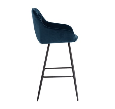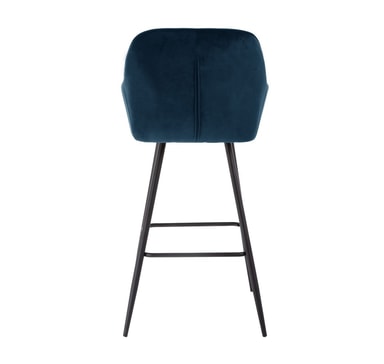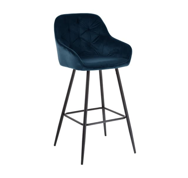 Baarituoli BRITA, tummansininen sametti. Mukavasti muotoiltu taivutettu vaneri istuin on kevyesti verhoiltu ja päällystetty samettikankaalla. Päällysmateriaali: 100 % polyesteri, 260g/m². Martindale 25 000. Tuolin jalat ja runko on valmistettu metallista ja viimeistelty mustalla jauhemaalilla. Tuolin kokonaismitat ovat 53x55xH109cm, istuimen leveys 38cm, istuinsyvyys 43cm, istuinkorkeus 75cm. Selkänojan korkeus 37cm, jalkatuen korkeus 29cm. Painoraja 120kg.