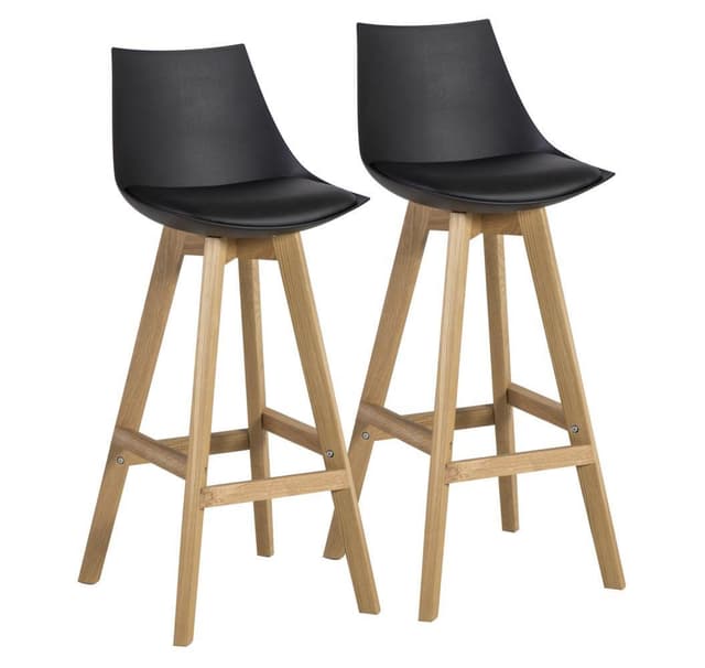Baarituolit SONJA 2kpl 41x41,5xH99cm, istuin: muovi / keinonahka, väri: musta, jalat: tammi. Istuinkorkeus 75cm, istuimen leveys 41cm, istuimen syvyys 35cm, selkänojan korkeus 25,5cm. Painoraja 100kg.