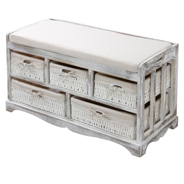 Tämä käytännöllinen huonekalu ECD-Germany on täydellinen sopiva lastenhuone, makuuhuone tai kylpyhuone käytävällä. Vuoteen koristeellinen ja tyylikäs mielestä hän on todellinen katseenvangitsija. Kodiksi lisälaite pukeutuja luo mukava istuma sekä runsaasti säilytystilaa. Viiden mukana korit antamaan tilaa kenkiä, sateenvarjo, huivi ja paljon muuta. Pankki tarjoaa ihanteellisen istuimet voidaan sitominen kenkäsi mukavasti. Lisäetuna: Kiitos Reißverscluss viite istuintyyny on irrotettava ja pestävä niin! Maalaistyyliin tekee luonnollisen ilmeen ja tuo mukavuutta kotiisi.