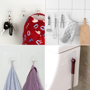 Vedenkestävät ""näkymättömät"" koukut: Seinäkoukut on valmistettu läpinäkyvästä muovimateriaalista ja ne ovat itseliimautuvia helpon ja joustavan asennuksen vuoksi ilman porausta. Yksinkertaisen, tyylikkään muotoilunsa ansiosta ne sopivat koko kotiin, esimerkiksi pyyhkeiden, avainten tai keittiövälineiden ripustimiin.