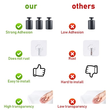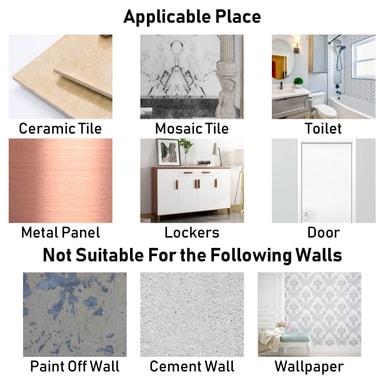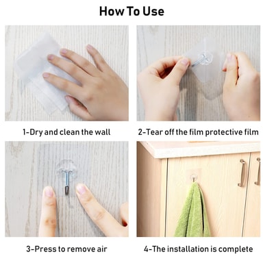 Helppo asentaa ja irrottaa: Irrota vain suojakalvo takaosasta ja kiinnitä seinäkoukku haluamaasi paikkaan. Huomautus: Jotta koukku tarttuu kunnolla, pinnan on oltava sileä ja puhdas. Voit helposti irrottaa koukun jättämättä jäämiä.