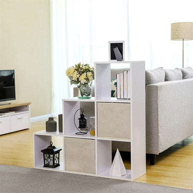 Tässä modernissa kirjahyllyssä valkoisessa porrasmaisessa muotoilussa yhdistyvät tyyli ja toiminnallisuus, ja se sopii täydellisesti olohuoneeseen, makuuhuoneeseen, toimistoon tai lastenhuoneeseen. Kuuden kuutio-osastonsa ansiosta se tarjoaa runsaasti säilytystilaa kirjoille, koristeille ja henkilökohtaisille tavaroille. Avoimen rakenteensa ansiosta siihen pääsee helposti käsiksi molemmilta puolilta, joten sitä voi käyttää myös tyylikkäänä huoneenjakajana.