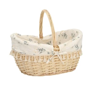 Korin materiaali: käsin kudottu luonnonvärinen pajupunottu kangas. Tekstiilivuori: puuvillakukkakuosilla varustettu kangas.